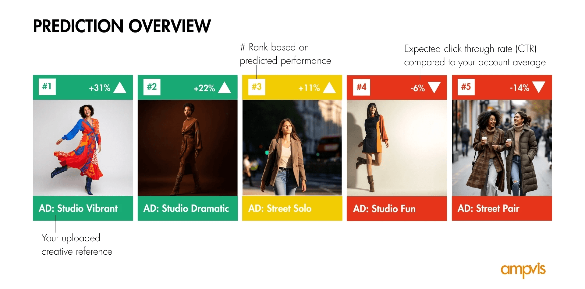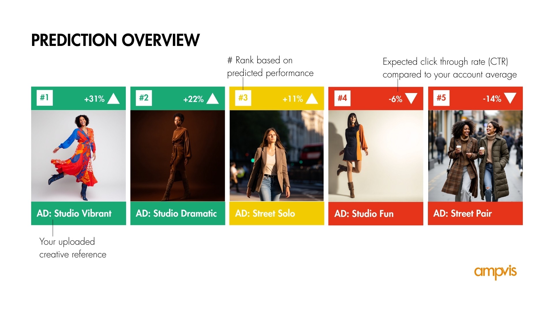A/B tests burn 15% of your ad budget on under-performing creative. AmpVis predicts winners upfront.